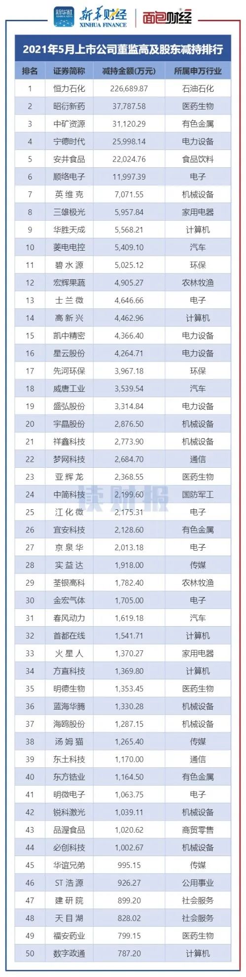 石油石化行业中,减持金额靠前的上市公司是恒力石化。信披数据显示,恒力石化董事范红卫在5月减持金额约为22.67亿元。