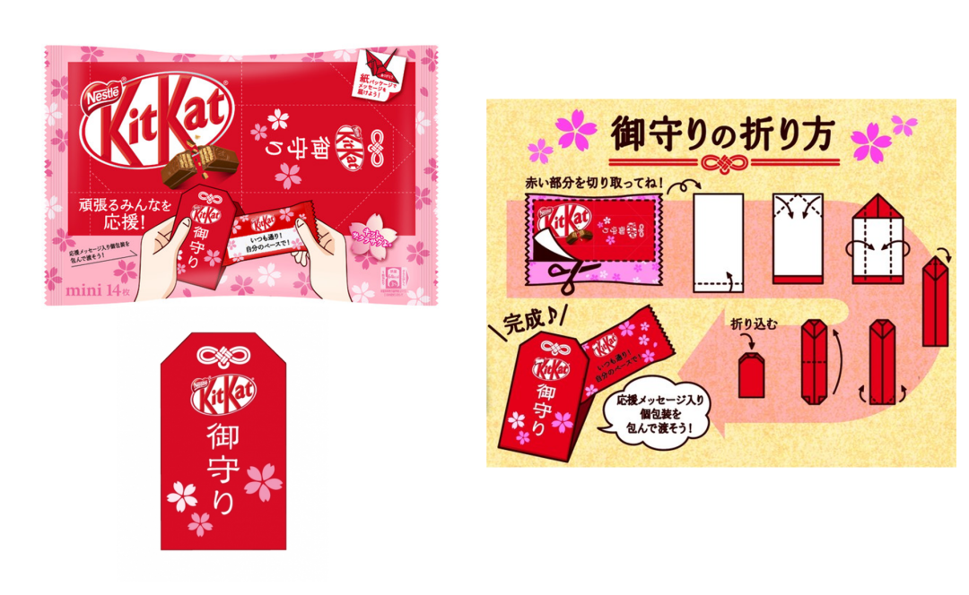 如KitKat曾发售过和“好预感”发音相同的伊予柑口味应援产品。2019年9月开始,雀巢将KitKat的大袋型产品外包装改为了纸包装,以应对海洋塑料垃圾污染问题。随着这一变化,雀巢以折纸鹤表达心意这一传统形式为灵感,发售了折纸护身符包装的考生应援产品,只要按照包装上的指示,就可以把纸包装折叠成一个小小的护身符,装上巧克力送给考生,向考生表达自己的祝福。