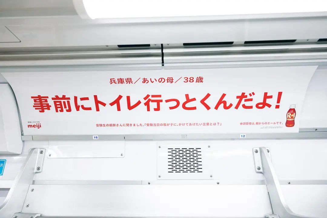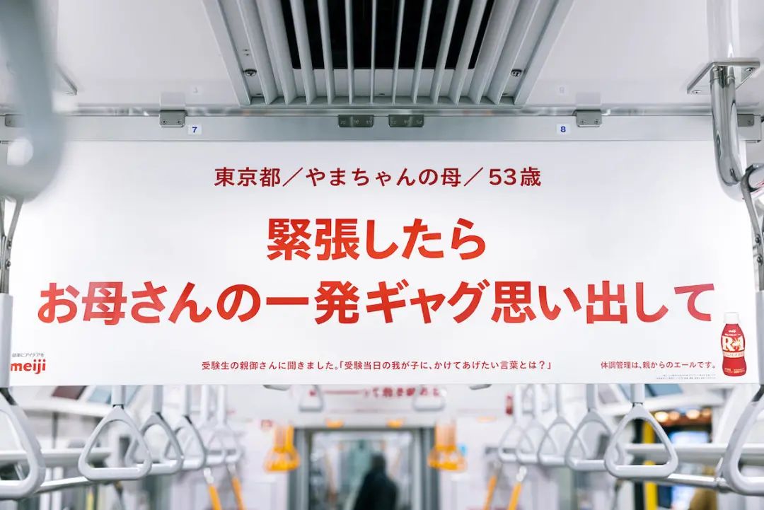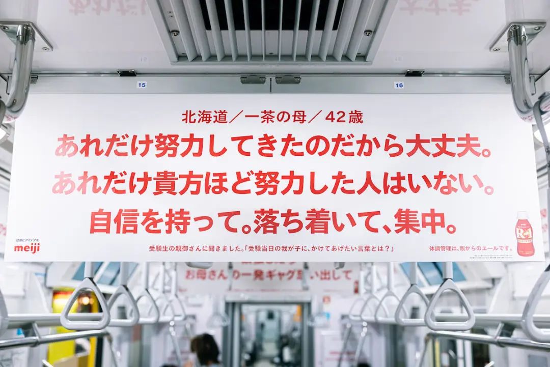 明治利用了在推特上收集到的考生家长的真情留言作为广告,如在地铁车厢内可以看到“没忘东西吧?准考证带了吗?”“妈妈把全部的力量都给你!”“进考场之前记得去趟厕所!”“加了个油!”“如果紧张的话就想想妈妈给你讲的笑话!”“已经那么努力了所以一定没问题。没有比你更努力的人了。自信,冷静,集中精神。”等等