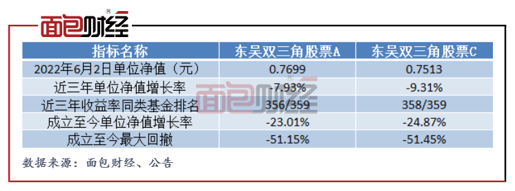 成立4年多时间以来,东吴双三角股票A份额单位净值下跌23.01%,最新单位净值不足0.8元。