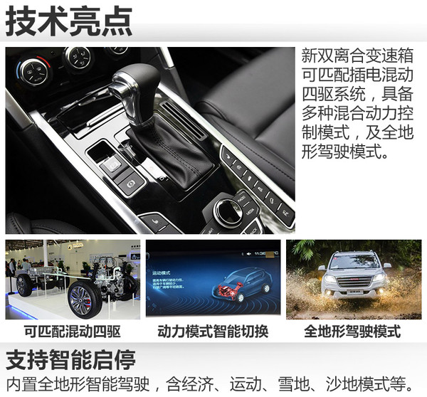 该双离合器变速器应用于插电式混合动力汽车时,可匹配其他混动、纯电动等多种混合动力控制模式,可实现纯电动、混动、传统动力等多种动力模式智能切换以及各种智能控制功能,如智能启停、制动能量回收等,且内置全地形智能驾驶模式(如经济模式、运动模式、雪地模式、沙地模式等),使驾驶者在不同的驾驶模式下体会更多的驾驶方式及乐趣。