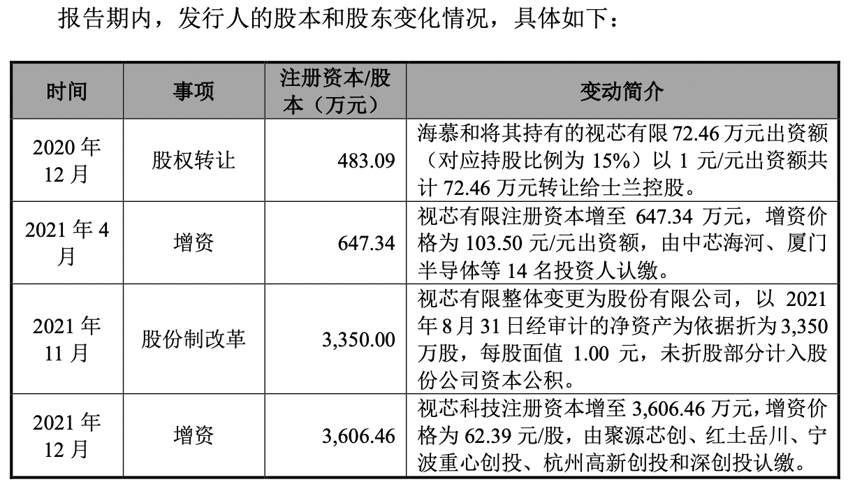 2016年7月8日,士兰控股、海慕和、士兰微、赵建东和应晓共同出资设立视芯有限,注册资本400万元。其中士兰控股出资112.73 万元、海慕和出资220 万元、士兰微出资24万元、 赵建东出资31.13万元、应晓出资12.14万元。