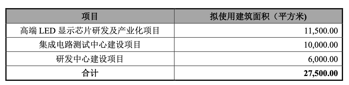 招股书显示,公司通过“高端LED显示芯片研发及产业化项目”新建27500平方米的研发及办公场地,另外两个项目不单独购置场地,在上述场地上开展,具体如下: