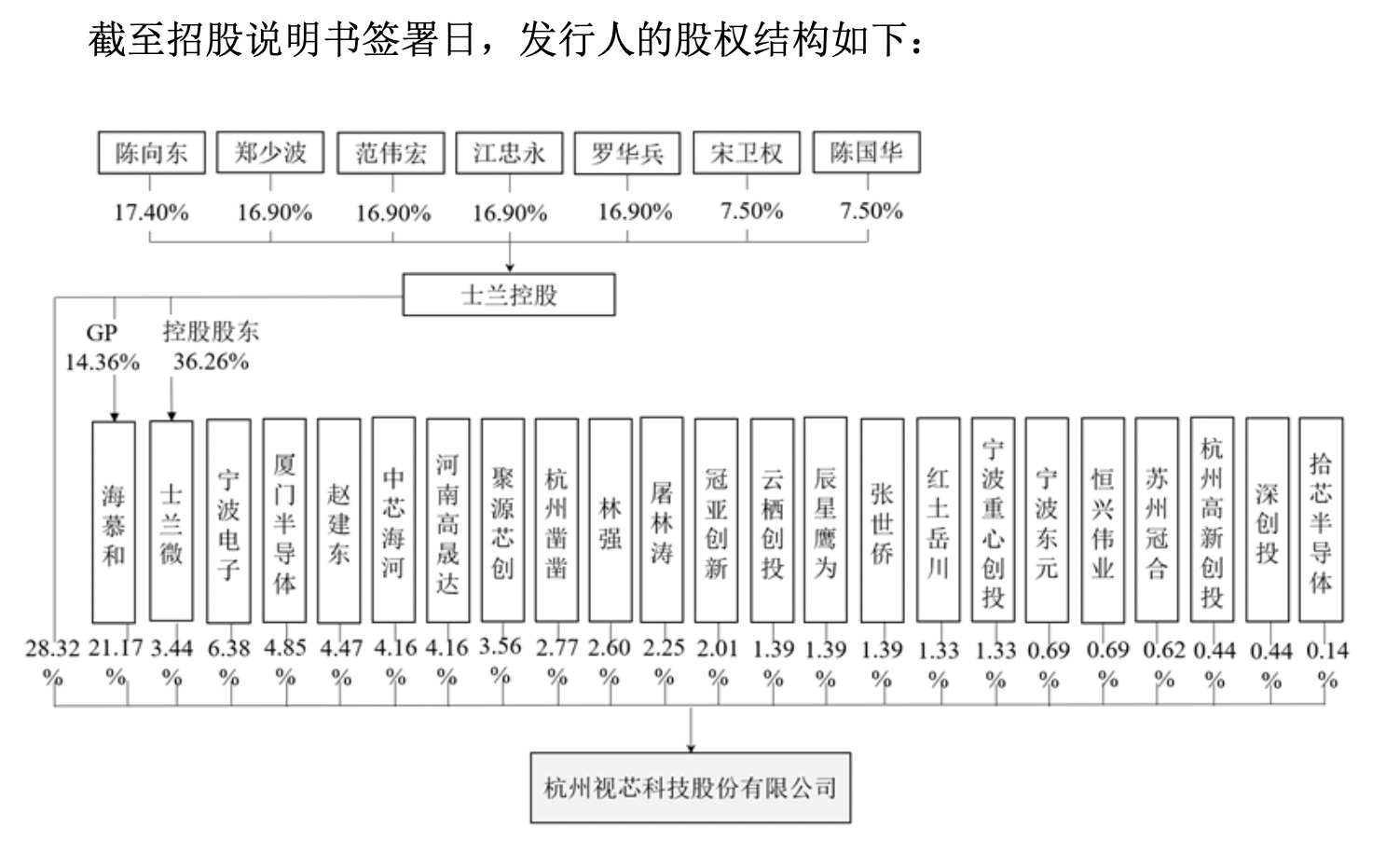IPO前,视芯科技的控股股东为士兰控股,实际控制人为陈向东、郑少波、范伟宏、江忠永、罗华兵、宋卫权和陈国华,前述7人合计控制52.93%的股份。