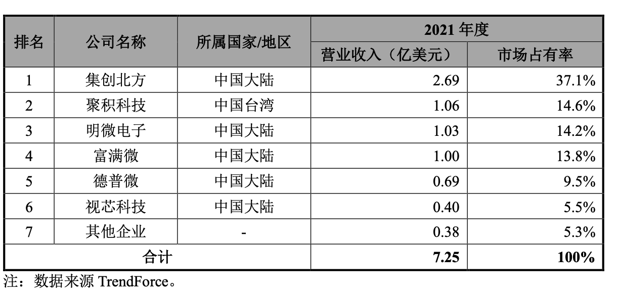 根据TrendForce数据,2021年全球LED显示驱动芯片营收排名前六的厂商分别为集创北方、聚积科技、明微电子(688699.SH)、富满微(300671.SZ)、德普微和视芯科技,合计市场占有率近95%。 其中,视芯科技的市场占有率为5.5%,市场排名第6。