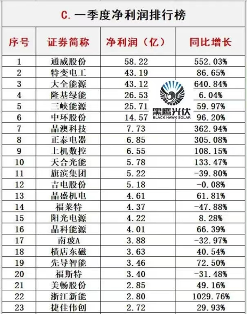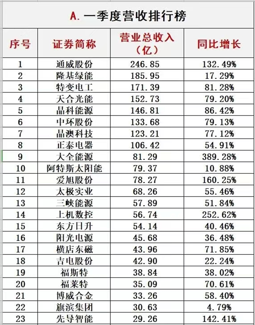 根据发布的光伏一季度财报,我们发现了比较有趣的现象。比如说,硅料企业摘夺净利润三甲位置,龙头通威股份(600438.SH)登顶营收、利润双榜首。组件企业营收虽然同比上涨,但是利润却较硅料企业相距甚远。