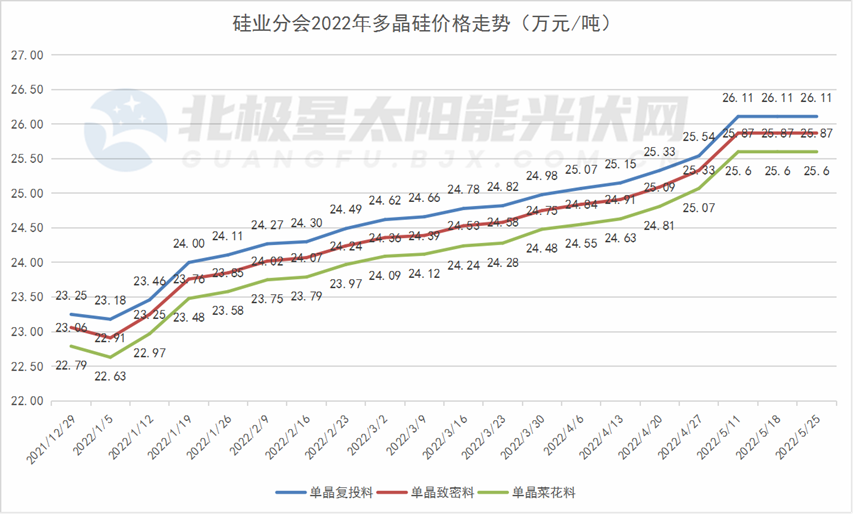 2022年,下游需求有增无减,硅料再度踏上涨价的路途。年初至5月11日,硅料实现16连涨,价格来到26万/吨。此后,硅料连续三周保持高位,价格维持在26万/吨左右。