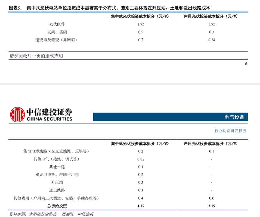 据中信建投测算,集中式光伏成本大概为4.17元/W,而户用分布式光伏的成本仅仅为3.19元/W,差距巨大。