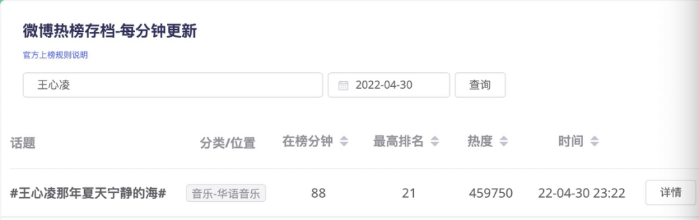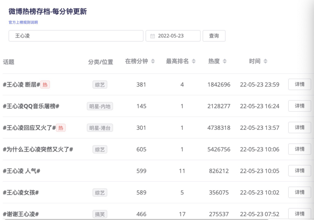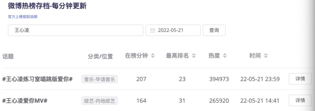 5月20日《浪姐3》开播当天,#王心凌乘风破浪再唱爱你#拿下微抖双榜热一后。接着5月21日又跟进了类似热搜话题#王心凌练习室唱跳版爱你#、#王心凌爱你MV#,但热度效果一般。