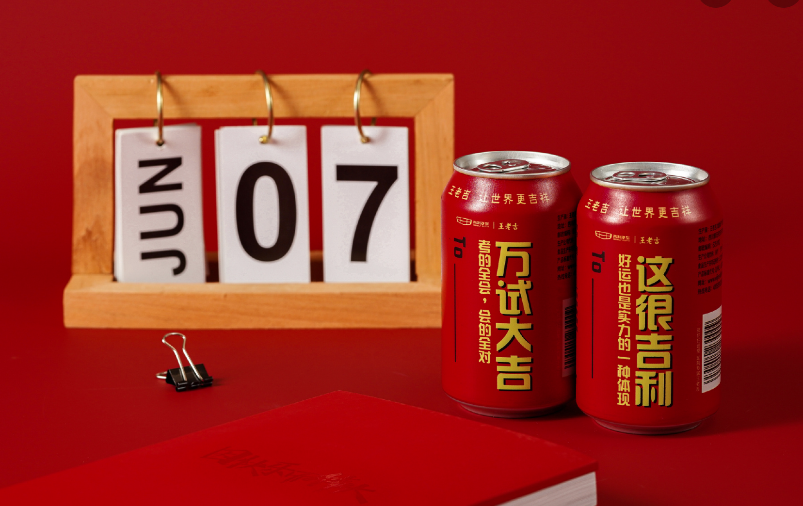 比如,延续了去年“高考大吉罐”“谢师罐”等操作,王老吉今年在其“吉”宇宙又更新了“科科加吉 万试大吉”系列,瓶身印着“高考大吉”“语文大吉”等字样,还提早一个月提交了高考类商标的注册申请,并在其微博吆喝“高考应援仪式感”话题。