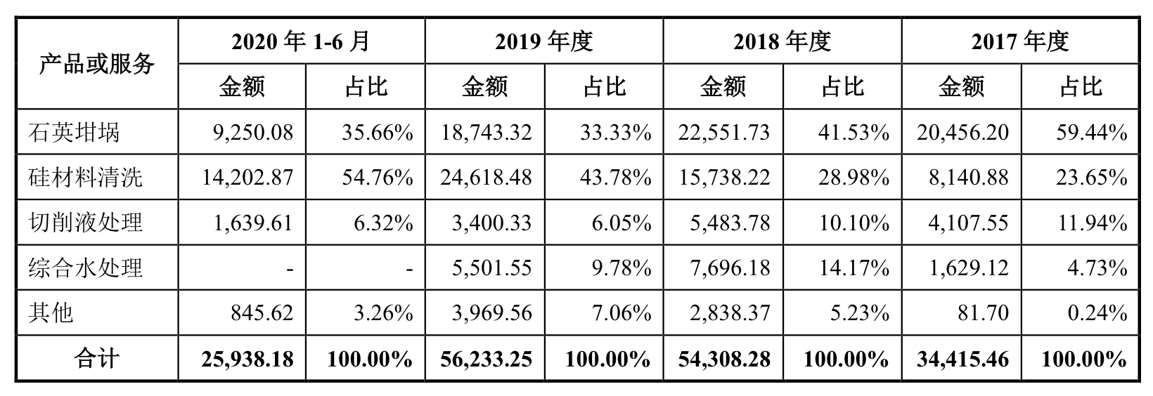 2019年和2020年上半年欧晶科技的营业收入分别为5.74亿元和2.6亿元,净利润分别为6193.71万元和4240.95万元。从收入构成来看,2020年上半年石英坩埚业务占比35%,硅材料清洗占比55%左右,切削液处理只占比6%左右,综合水处理业务已被剥离。