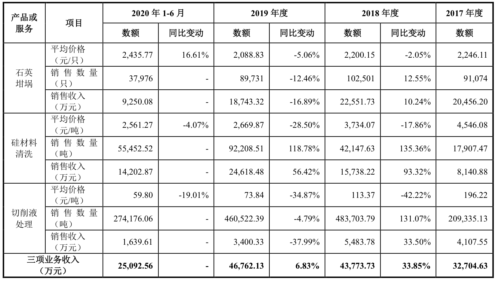 石英坩埚业务,2017年至2019年的平均价格分别为2246.11元/只、2200.15元/只、2088.83元/只,好在2020年上半年价格回暖,升到了2435.77元/只。