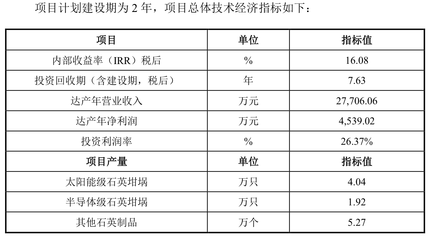 目前,欧晶科技共有10条太阳能级石英坩埚及其他石英制品生产线,项目实施后,计划通过引进先进设备及对现有车间进行改造的方式,将其中4条产能较小、设备设施较为落后的生产线升级为达到国际水平的太阳能级石英制品生产线;利用公司现有土地扩建2条半导体级石英坩埚生产线。此项目预计达产的营业收入2.77亿元,净利润4539.02万元。
