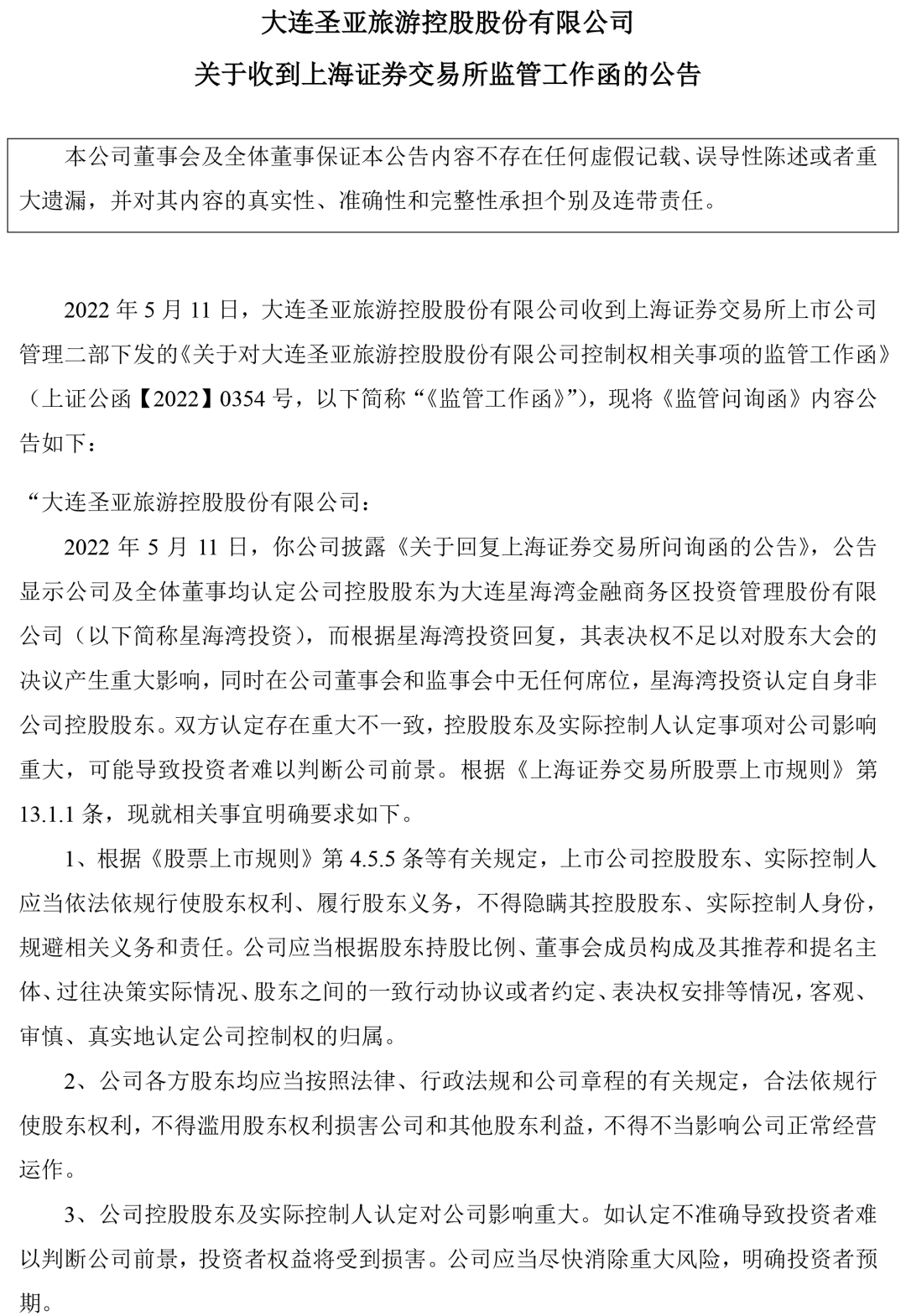 5月11日晚间,大连圣亚刚回复完上交所问询函,又收到一封监管工作函。这封监管工作函里重点提出了大连圣亚控制权存在分歧。大连圣亚及全体董事认为大连星海湾金融商务区投资管理公司(以下简称“星海湾投资”)为公司控股股东,但星海湾投资却拒绝认领,否认控股权,认为其表决权不足以对股东大会的决议产生重大影响,并且在公司董事会和监事会中无任何席位,所以自己并非公司控股股东。