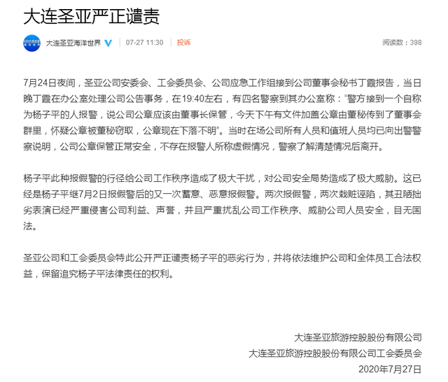 随后,2020年7月27日,大连圣亚官网发布了一则关于“公章被丢失”的报假警公告,内容称“警方接到一个自称为杨子平的人报警,说公司公章应该由董事长保管,目前怀疑公章被董秘窃取,公章现在下落不明。”此事虽无法证明真伪,但从侧面仍可反映出杨子平执掌大连圣亚过程并不那么顺利。