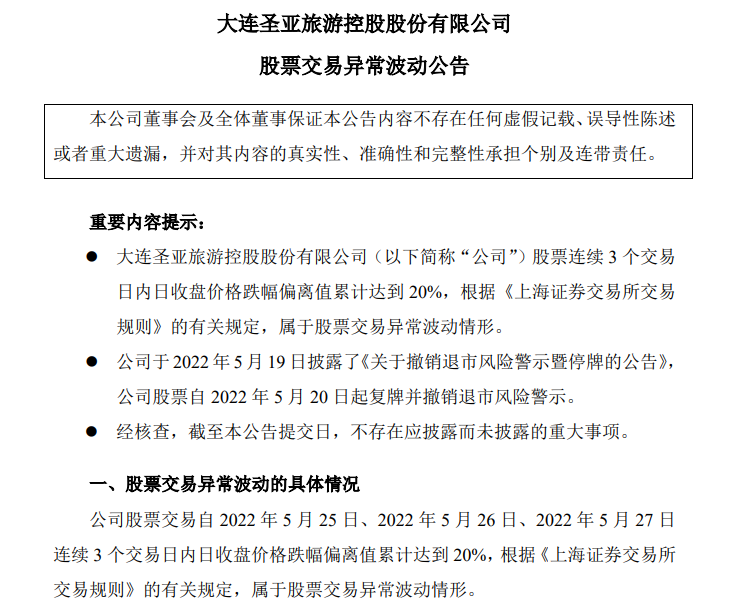 而在此之前,大连圣亚股票交易出现异常波动。据其5月27日公告,大连圣亚股票交易自2022年5月25日、2022年5月26日、2022年5月27日连续3个交易日内日收盘价格跌幅偏离值累计达到20%,根据《上海证券交易所交易规则》有关规定,属于股票交易异常波动情形。值得注意的是,根据A股规定,个股股价波动非常剧烈会被调查,经大连圣亚自查,其生产经营活动正常,日常经营情况未发生重大变化。