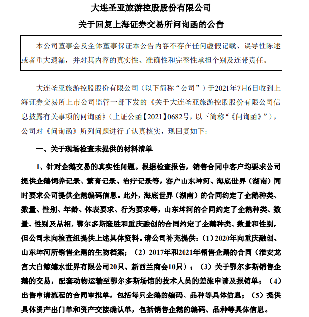 但最终这部分收入受到上交所问询和质疑,销售收入属于与主营业务无关的业务收入,2020年扣除售卖企鹅的收入后大连圣亚营业收入为0.84亿元,触及《上海证券交易所股票上市规则(2020年12月修订)》第13.3.2条“最近一个会计年度经审计的净利润为负值且营业收入低于人民币1亿元”的退市风险警示规定,大连圣亚股票最终没有逃脱被实施风险警示的“命运”,其股票于2021年7月22日实施退市风险警示。