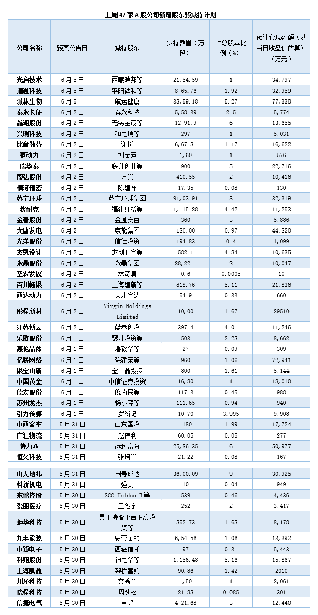 上周(5月30日至6月5日),A股公司预减持规模有所减少。据界面新闻不完全统计,共有47家A股公司披露股东减持计划。