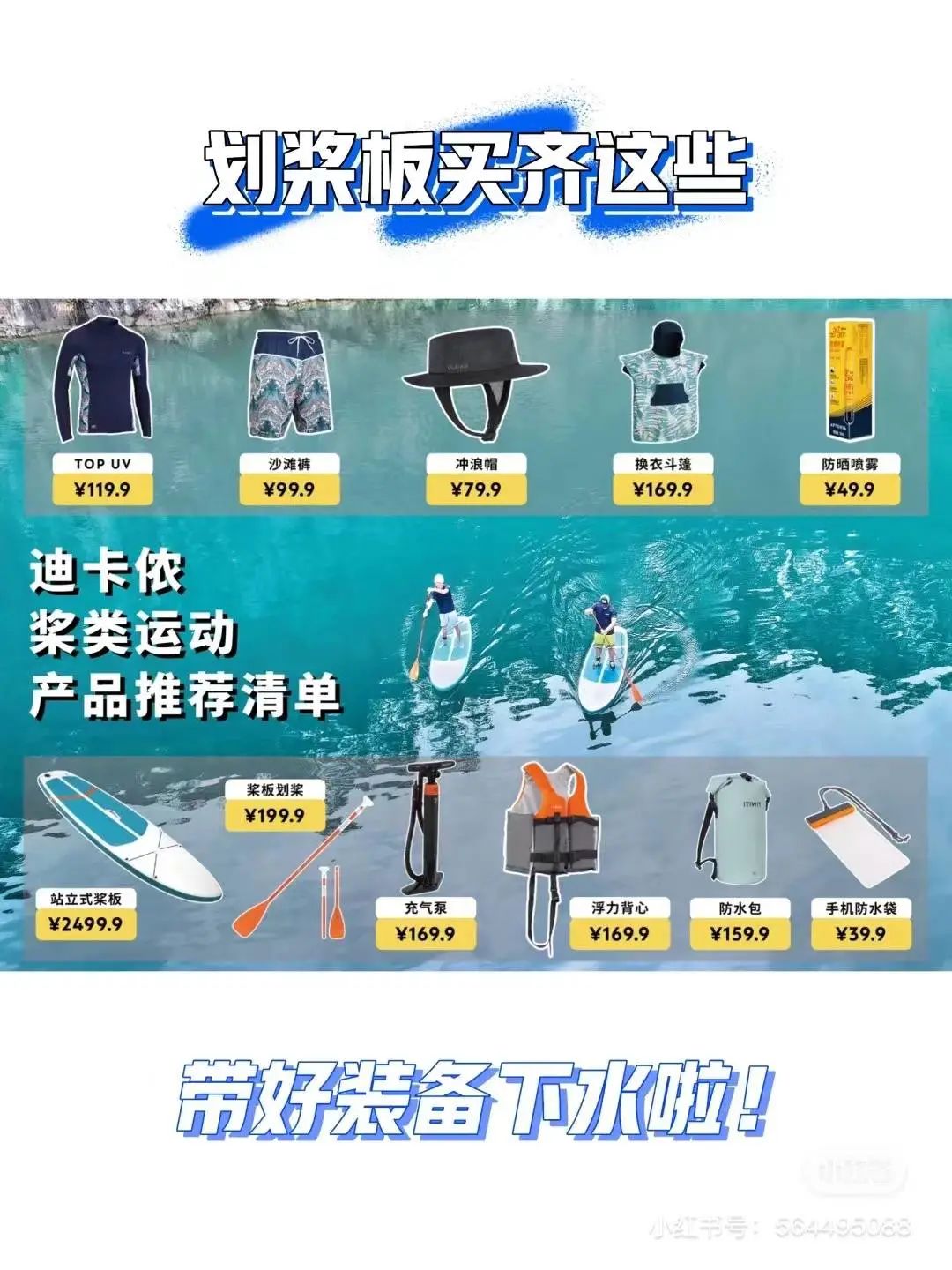 一套基础的立式桨板运动装备分为:桨板(充气型和硬板型)、划桨、救生衣、充气泵、个人用品(泳装、防晒霜、手机防水袋、遮阳帽)等。而这些基本配置,都可以在网上买到。