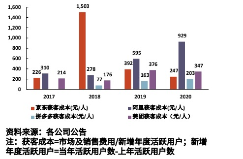 光大证券用“营销费用支出/新增年度活跃用户数”来测算获客成本发现,阿里系电商获客成本从2018年的278元/人增长到2020年的929元/人,增长近234%;拼多多的获客成本则从2018年的77元/人增长到2020年的203元/人,增长近164%;美团则从2018年的214元/人增长到2020年的347元/人,增长62%。