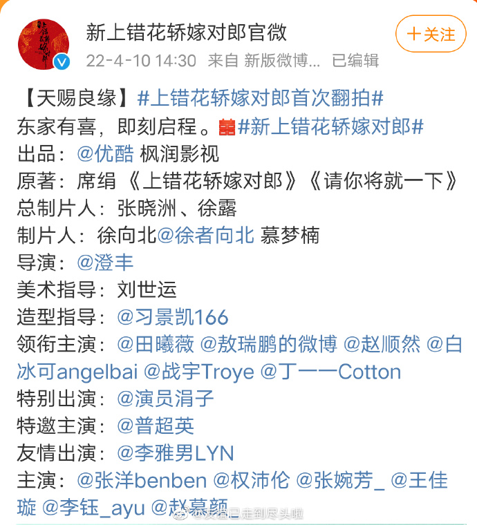 还有一部经常用来打脸当今古偶的“网红老剧”《上错花轿嫁对郎》。原以为2021年李庚希那部《花好月又圆》就是它的翻拍新版,哪知今年4月,又有一部新版《上错花轿》开机,还打上“首次翻拍”的tag,兼有老版主演隔空站台。