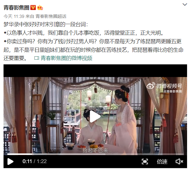 当然,比之关汉卿原著、比之更早的《爱情宝典》,《梦华录》还是有一些下头点的——原著歌颂的正是底层互救,是“仗义每多屠狗辈”。《梦华录》的改编却对人物的妓女身份遮遮掩掩、百般找补,还整出个卖艺卖身的鄙视链来。
