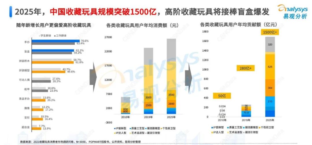 关于收藏玩具行业,根据易观分析发布的《2021中国收藏玩具行业市场洞察分析》显示,2019我国人均gdp超过1万美元,也由此开启了收藏玩具行业的起爆点进入爆发期(2020-2028年)。报告预计2025年,我国收藏玩具市场规模将突破1500亿元,整体市场增速高达35%。同时,以男性为主的IP达人型群体将贡献最大增量,机甲变形、人偶、超合金等高阶收藏玩具将贡献主要增量。与此同时,潮流跟随型人群的消费升级,将使得盲盒类销售增速趋缓,未来五年的复合增长率24.34%,市场规模约210亿。