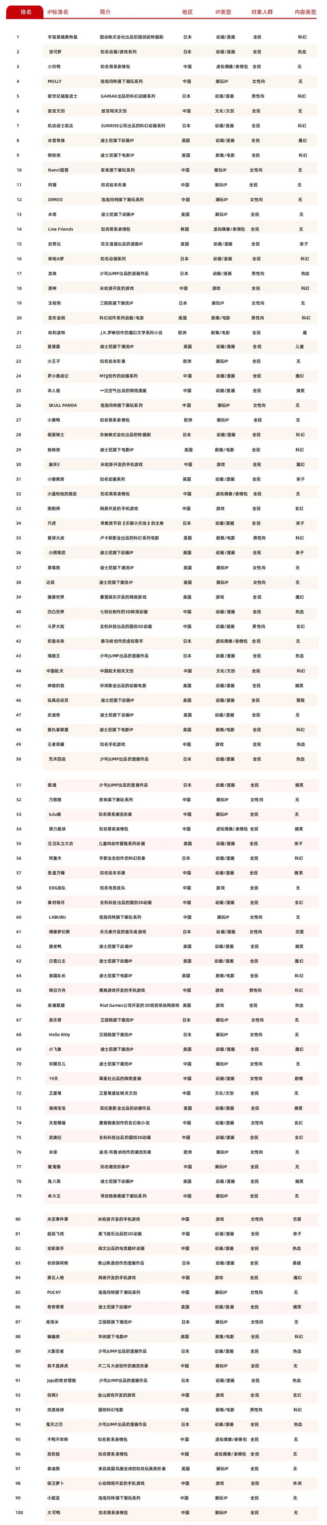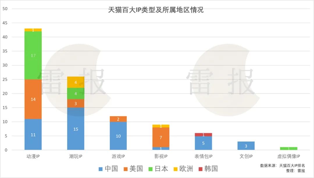 其中,45个中国IP由15个潮玩IP、11个动漫IP、10个游戏IP、5个表情包IP、3个文创IP和1个影视IP组成;26个美国IP由14个动漫IP、7个影视IP、3个潮玩IP、2个游戏IP组成;22个日本IP由17个动漫IP、4个潮玩IP和1个虚拟偶像IP组成;6个欧洲IP由4个潮玩IP、1个动漫IP和1个影视IP组成。韩国IP仅有一个萌系表情包Line Friends(14)上榜。