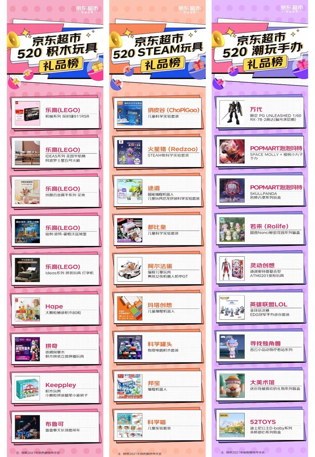 京东超市按照2021年销售额排序,发布的积木玩具、STEAM玩具、潮玩手办三大礼品榜中,乐高、俏皮谷、万代分别霸占三大榜单首位。其中潮玩手办榜单中,泡泡玛特、若来(rolife)、寻找独角兽、52TOYS等国内知名潮玩品牌旗下产品均进入榜单。