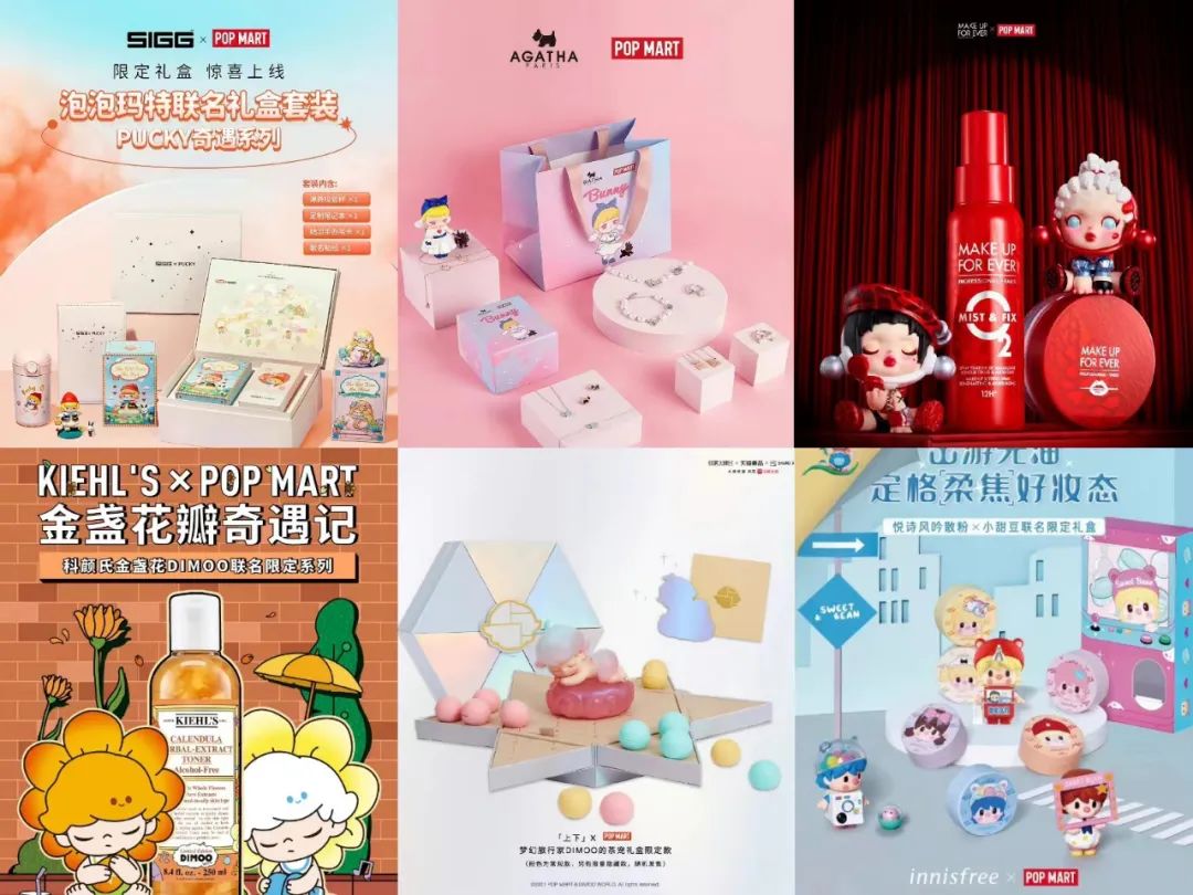以泡泡玛特为代表的多个潮玩公司,就积极推动旗下IP与美妆、香水等品牌展开广泛的联名,一方面提高IP变现能力,另一方面进一步提升IP的曝光度。泡泡玛特旗下的Molly、Dimoo、Pucky等具有较大粉丝基数的潮玩 IP,基于其自身调性与知名度,与不同 类型、不同价格带的外部品牌展开联名。例如,泡泡玛特与 Makeup Forever、梦妆、馥蕾诗等推出联名产品;与科颜氏、YSL、上下(爱马仕入股品牌)等推出联名礼盒。此外,TOP TOY、52TOYS、星际熊等潮玩品牌均积极推动旗下潮玩形象IP与食品饮料、服饰鞋帽等品类展开跨界联名。