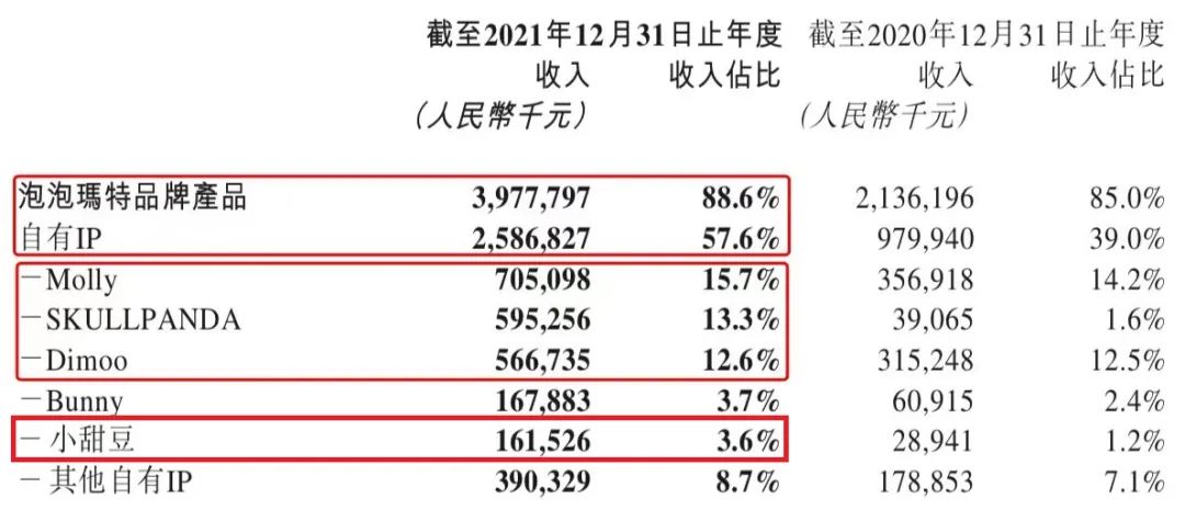 泡泡玛特以6个潮玩IP排在公司中的第三位,旗下进榜IP包括:Molly(4)、DIMOO(12)、SKULL PANDA(26)、LABUBU(60)、PUCKY(85)、小甜豆(99)。根据泡泡玛特2021年财报显示,2021年Molly、DIMOO、SKULL PANDA以及小甜豆四大IP分别贡献收入7.05亿、5.67亿、5.95亿及1.62亿元,合计贡献营收超20亿,占公司年度总营收的45.2%。