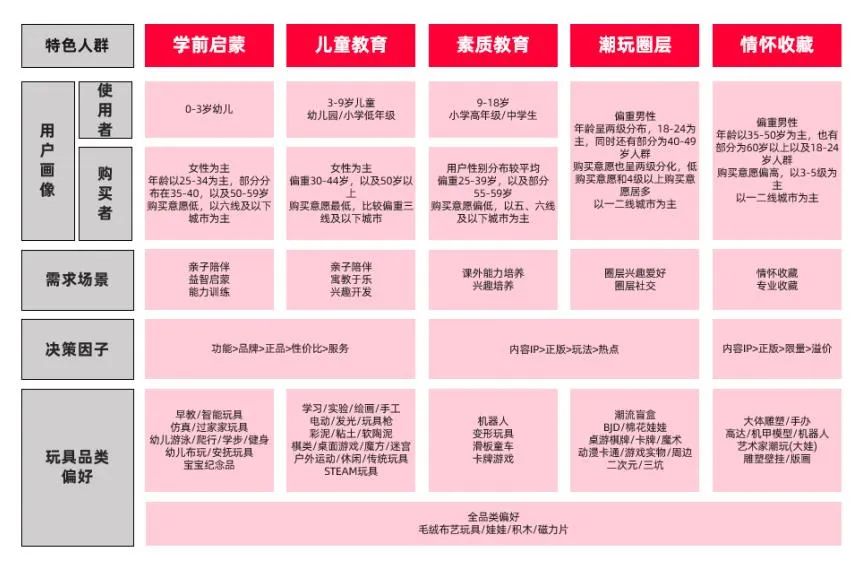 由于潮流玩具行业所涵盖的儿童玩具、潮流玩具以及收藏玩具三大类型玩具所面对的是是不同的用户市场,供给差异性也较大,天猫根据其消费者的购买需求与产品偏好,将用户群细分为“学前启蒙”、“儿童教育”、“素质教育”、“潮玩圈层”和“情怀收藏”五大特色人群。