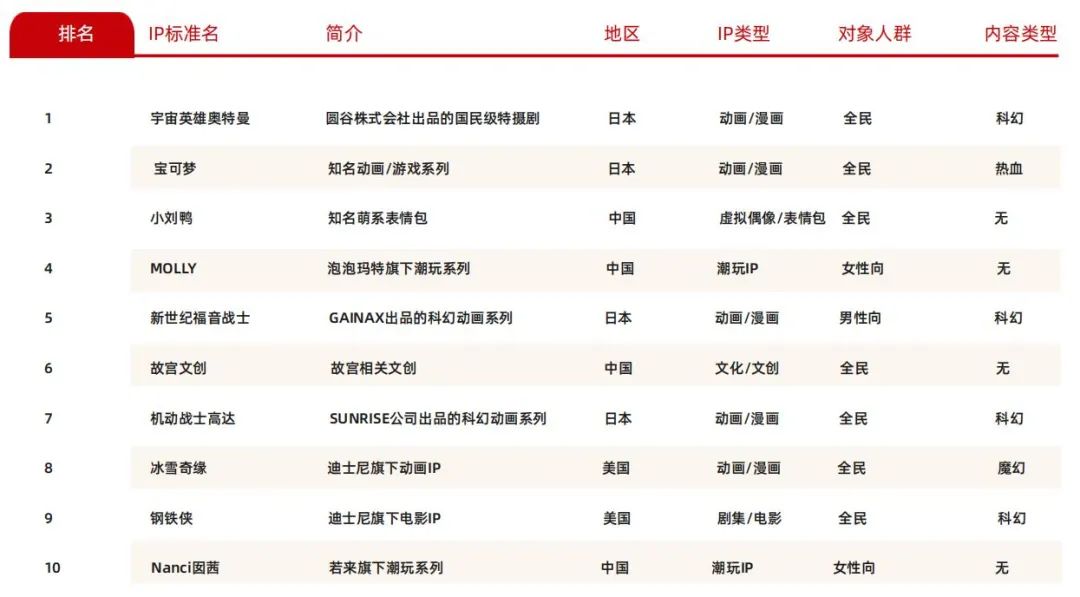 仅看TOP10IP,中国IP也占据四席之多,与日本IP平分秋色,美国IP占据两席。进入TOP10的中国IP分别是小刘鸭(3)、Molly(4)、故宫文创(6)、Nanci囡茜(10);进入TOP10的日本IP分别是奥特曼(1)、宝可梦(2)、新世纪福音战士(5)、机动战士高达(7);进入TOP10的美国IP则是来自迪士尼的冰雪奇缘(8)和钢铁侠(9)。