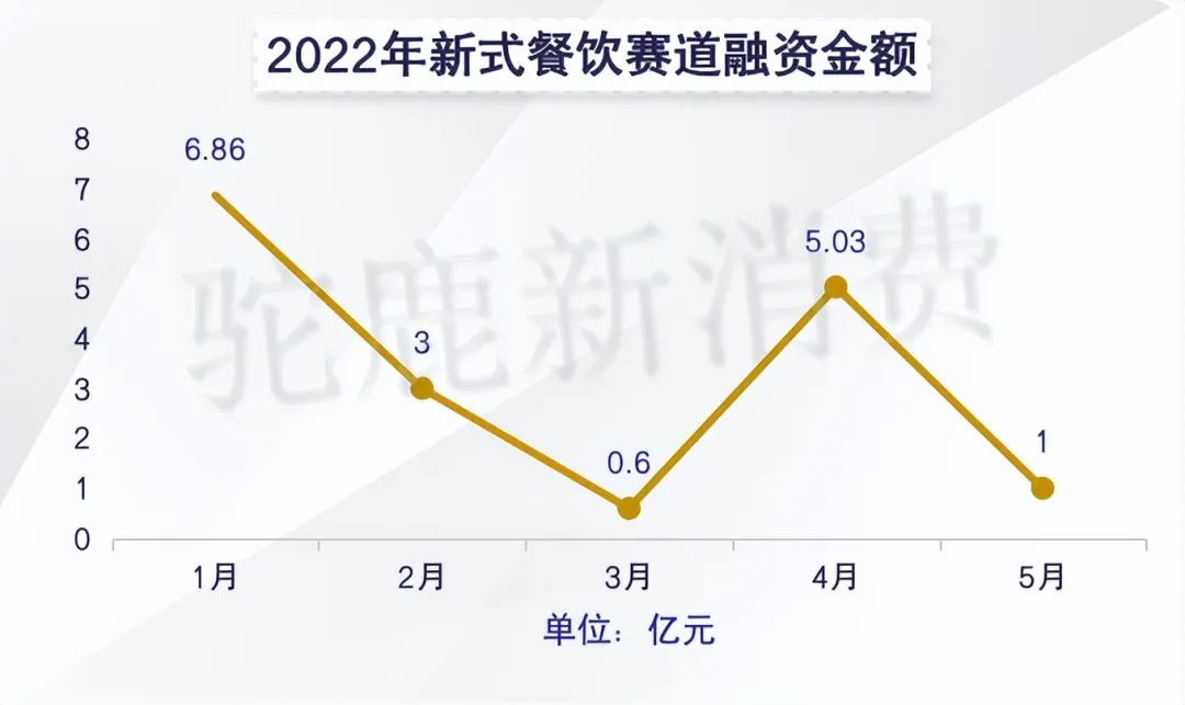 根据驼鹿新消费统计,2022年前五个月,新消费赛道融资出现显著降温的情况。尤其是食品饮料赛道,出现了连续5个月下降的态势。而餐饮赛道也呈现下降趋势,目前看仍受到疫情的影响,整个5月份,未能吸引更多的资本参与,仅仅有1亿元人民币进入这个赛道。