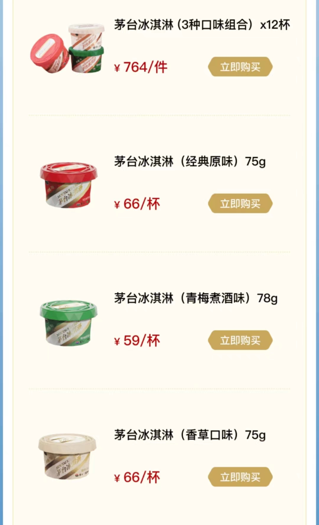 而在这之前,5月19日,在“i茅台”正式上线当天,茅台国际大酒店首家茅台冰激凌旗舰店也正式营业。该门店主要销售原味茅台、香草茅台两种口味冰淇淋,单价39元一杯。