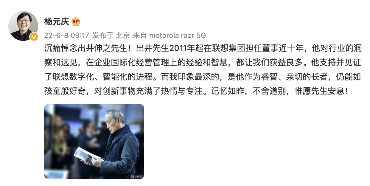 6月8日上午,联想集团董事长兼CEO、首席产品经理杨元庆微博发文悼念出井伸之。杨元庆表示,“出井先生2011年起在联想集团担任董事近十年,他对行业的洞察和远见,在企业国际化经营管理上的经验和智慧,都让我们获益良多。他支持并见证了联想数字化、智能化的进程。”