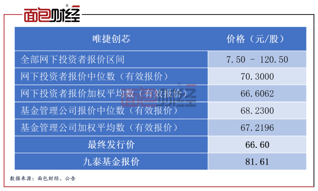 资料显示,唯捷创芯初步询价收到的报价区间为7.50元/股-120.50 元/股,其中网下全部投资者的报价加权平均数为66.61元/股、基金管理公司的报价加权平均数为67.22元/股,九泰基金的报价显著高于平均水平。