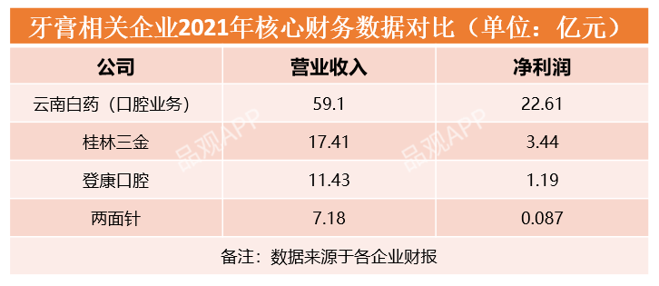 从2021年的营收看,登康医疗低于云南白药、桂林三金等牙膏相关企业,净利润仅高于两面针。