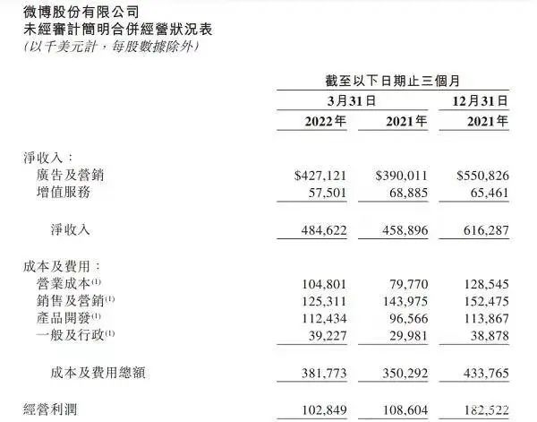 财报指出,2022年第一季微博增值服务收入为5750万美元,较上年同期的6890万美元下降17%。增值服务收入的下降主要由于会员服务收入和直播收入的下降。2022年第一季度的非经营亏损为1.635亿美元,上年同期亏损为4470万美元。2022年第一季度归属于微博的净亏损为6750万美元,上年同期为净利润4980万美元。