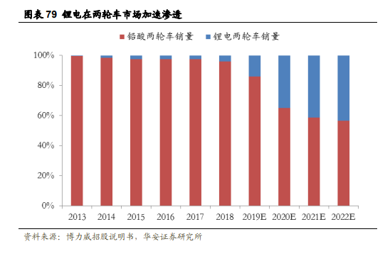 据华安证券的分析,自2017年以来,锂电在两轮车市场急速渗透,销量占比从原来的不足20%,已逐渐扩张到超过40%,与之伴随的是铅酸两轮车销量份额被蚕食。