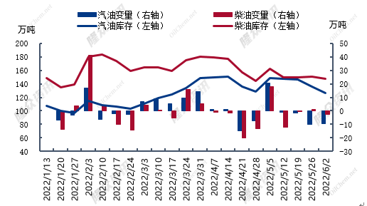 据隆众资讯数据,今年1-6月初,中国汽柴油商业库存呈先涨后跌趋势。截至6月2日当周,国内汽油商业库存与柴油库存分别为1469.36万吨、1680.2万吨,比今年高位4月14当周分别下降了9.05%、8.88%。