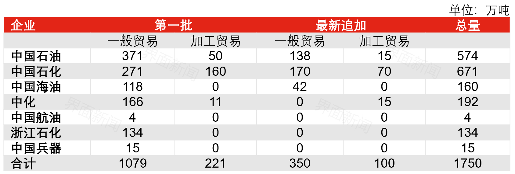 中国石油、中国石化、中国海油与中化获得了全部最新追加的450万吨出口配额。其中,中国石化获得的额度超过一半;中国石油、中国海油与中化的配额占比分别为34%、9.3%、3.3%。