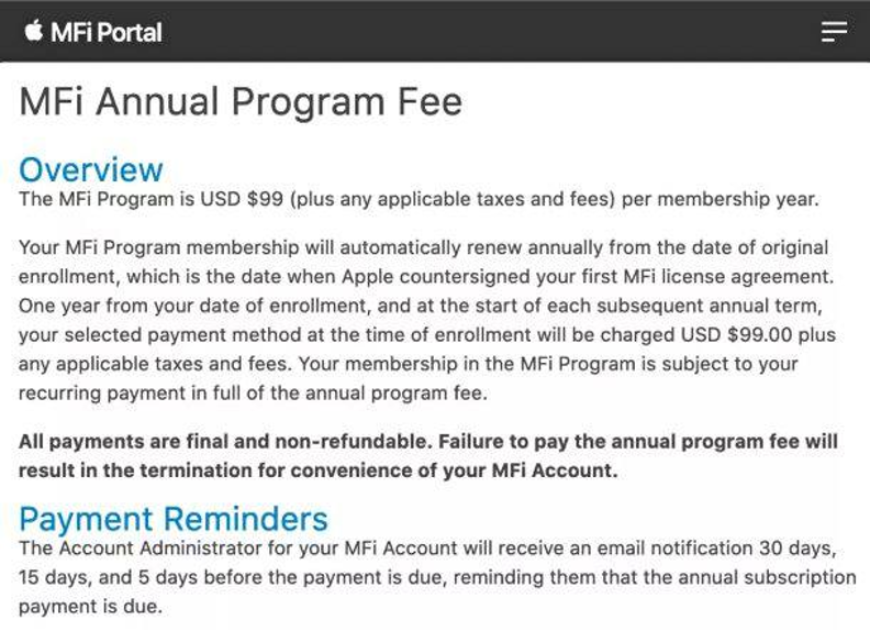 首先是每年99美元的Mfi计划会员。这是刚刚在2022年5月推出的收费计划。第三方厂商只有成为会员,才能生产MFi认证配件。