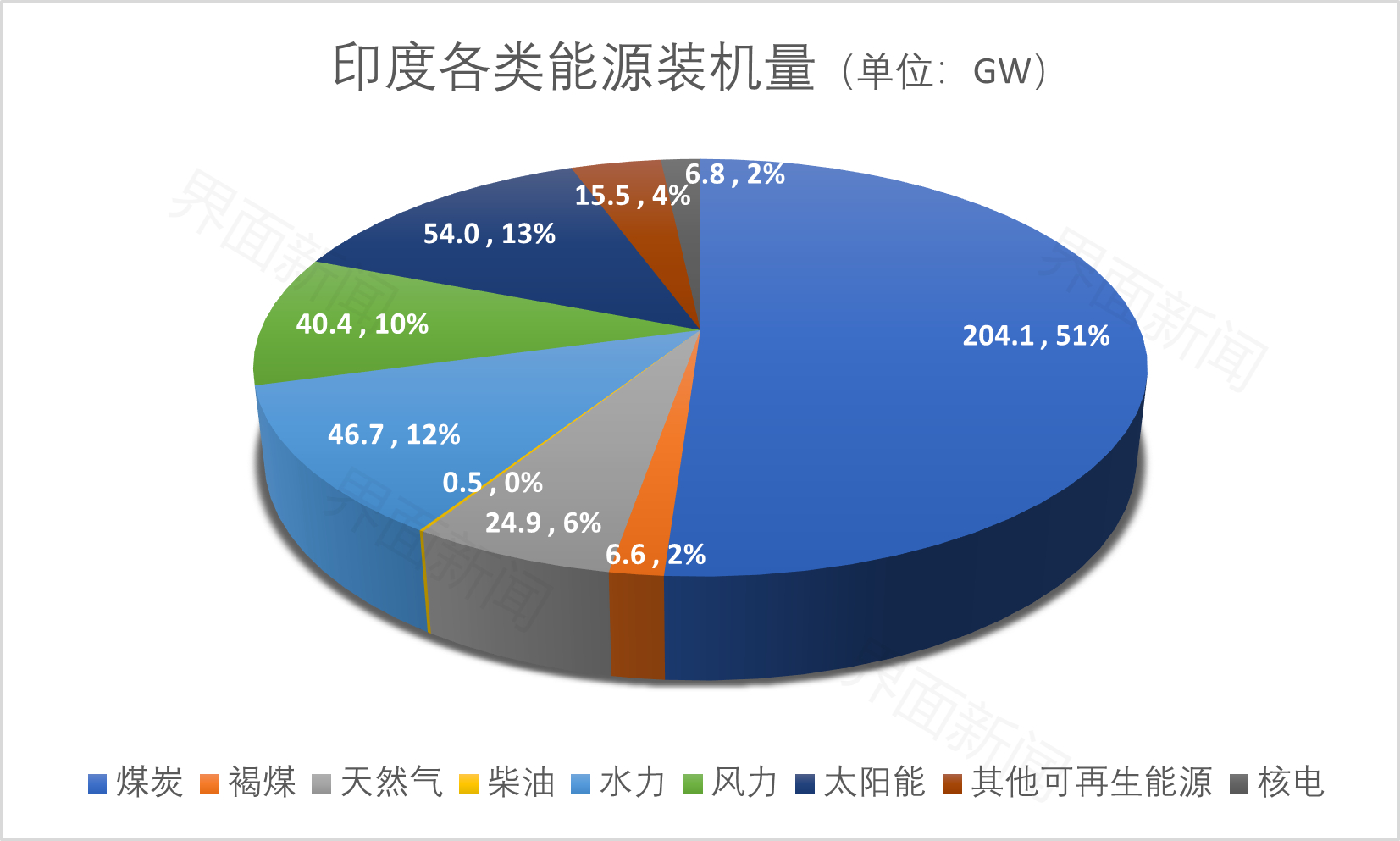 截至2022年3月31日,印度全国发电装机量接近400 GW,其中煤炭(包括褐煤)占比53%、天然气占比6%、可再生能源占比39.2%。