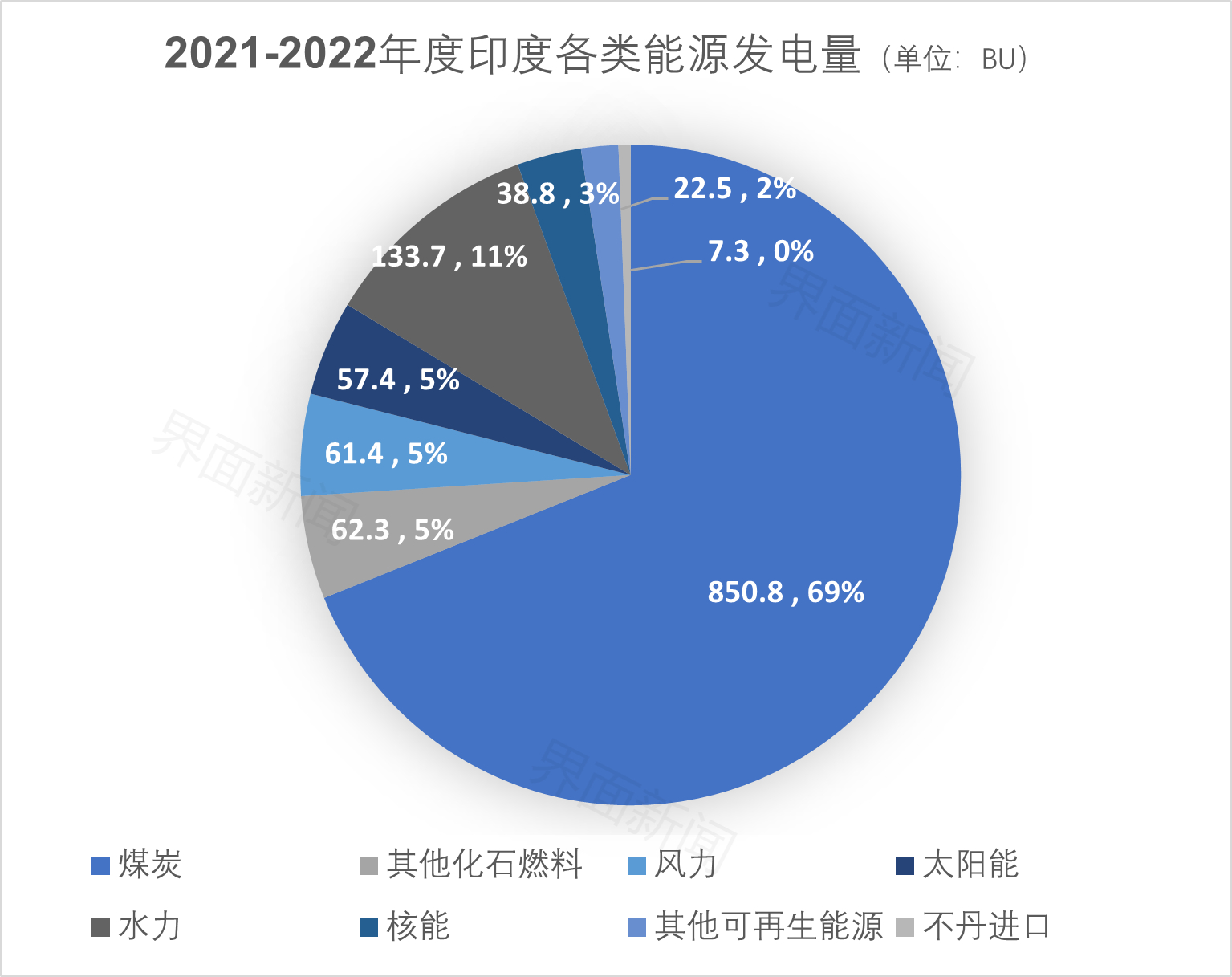 印度的电力长期高度依赖煤炭。印度电力局数据显示,去年印度煤炭发电占比69%,非化石燃料发电量占比25.3%。
