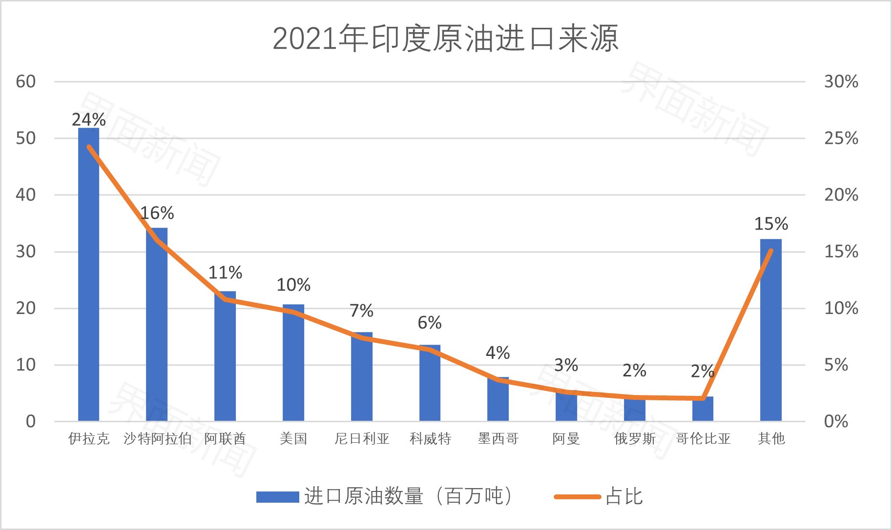 联合国贸易数据库显示,去年印度共进口约2.14亿吨原油,主要进口国为伊拉克(24%)、沙特阿拉伯(16%)、阿联酋(11%)和美国(10%)。