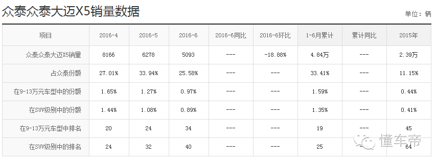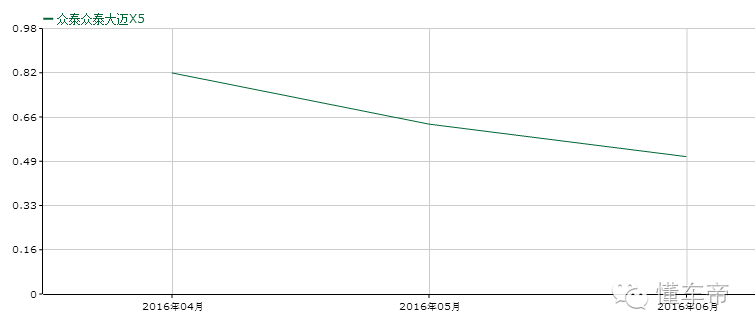 2015年9月,众泰顺应市场需求,推出了全新高品质紧凑型SUV—大迈X5。这款车型在上市后半年里,销量表现一直很不错。但从今年3月份之后,大迈X5的销量却一直表现不佳。根据搜狐数据,众泰大迈X5呈现每况愈下的趋势。4月份销量是8166辆,5月份销量只有6278辆,6月份直接下滑到5093辆。(详情见图一)