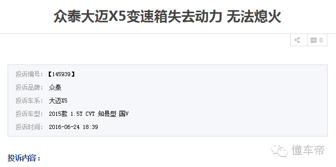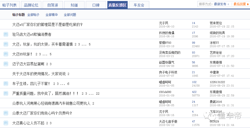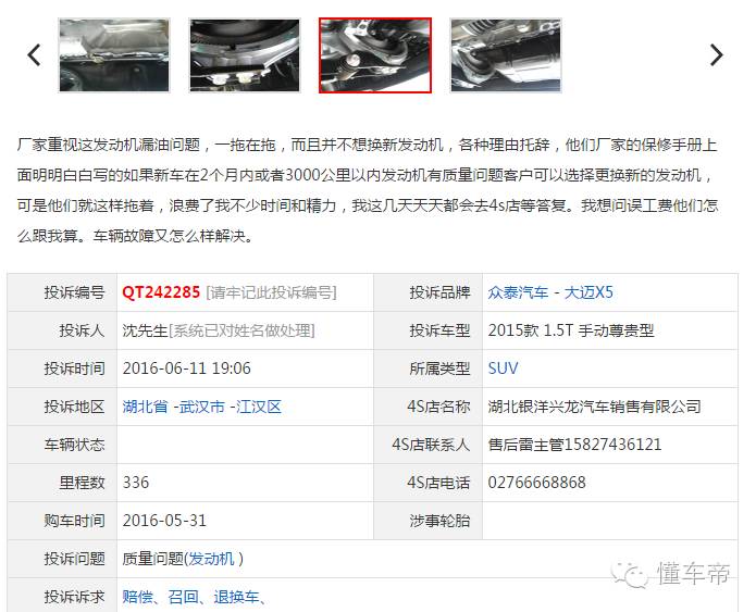 有相关人士指出:众泰大迈X5销量呈现下滑的局势与车型存在的质量问题未能得到解决有相应的关系。在车质网投诉列表上,也可看到大迈X5从上市到今年2月份,只有5个投诉,3月份0个投诉,但4月份到6月份投诉量增加了9个。主要集中在发动机漏油、发动机异响、变速箱换挡困难等问题。笔者还发现有部分车主在汽车之家论坛发布大量的发动机漏油的图片,并自嘲“中头奖”,希望厂家以及4S店给予解决方法。