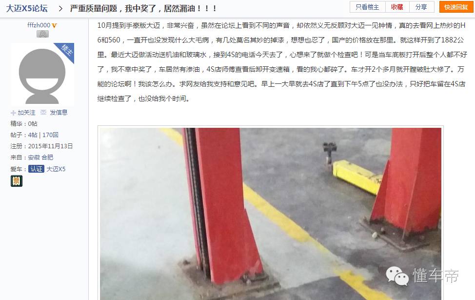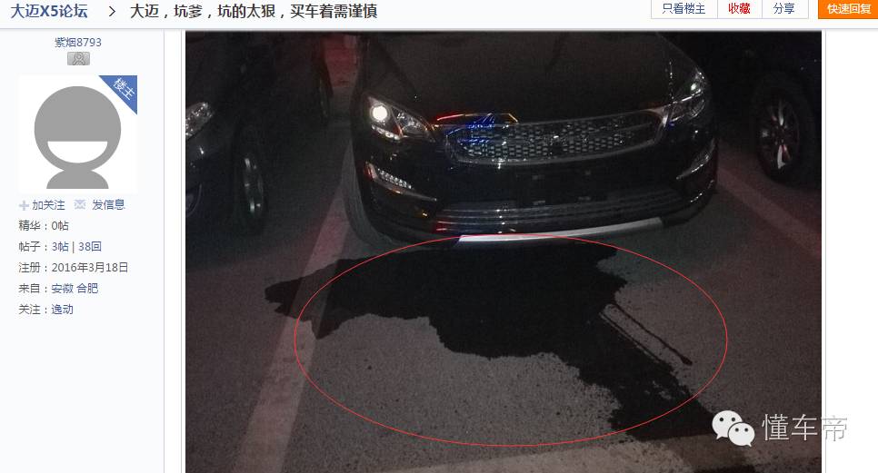 该车主很无奈地表示,才加的5L的机油,只是去吃个饭回来,“嗖”的一下,油都快漏光了。还被朋友嘲笑“买了大迈X5,等于中头奖”。