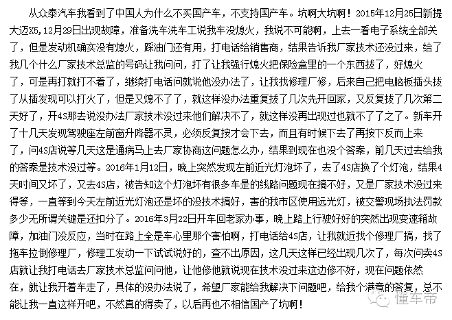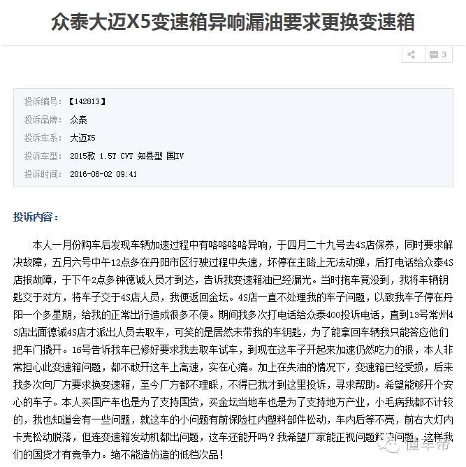 有不少车主在投诉中表示,大迈X5让他们对国产车失去了信心。希望厂家在车型出现问题时,能给予车主满意的解决方式,而不是一再地回避问题。变速箱故障是属于车子的大故障,不是一些车子的小毛病,这随时会涉及到车主的安全问题,必须引起重视。